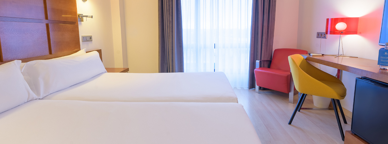 Modernas y luminosas habitaciones disponibles con dos camas individuales (twin), TV LCD, aire acondicionado frío / calor con control individual, acceso gratuito a Internet (WiFi), caja fuerte con capacidad para ordenador portátil, minibar y baño completo con bañera