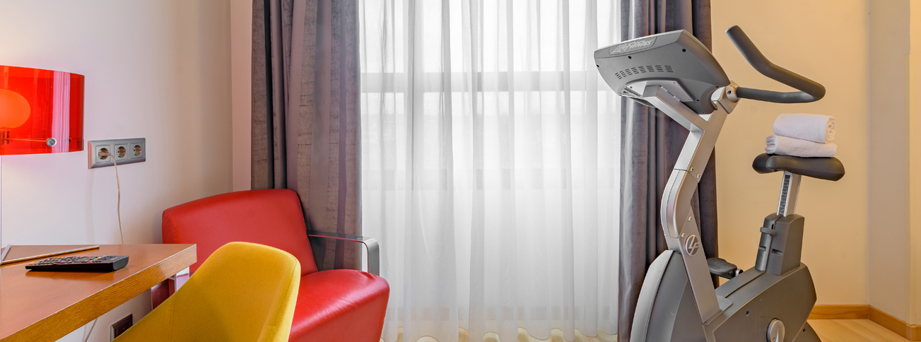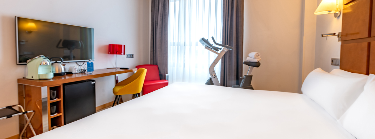 Ideal para aquellos que quieran mantenerse en forma dentro de la privacidad de su habitación. Incorpora equipamiento fitness de primera línea (bicicleta estática). Además, te regalamos nuestro Fitness Kit (agua mineral y dos toallas). Destacar que cuenta con Kettle para cafés e infusiones, Wi-fi gratuito, mini bar, así como con la nueva cama Dreamax desarrollada por Flex, que te permitirá disfrutar de un descanso perfecto en Zaragoza.